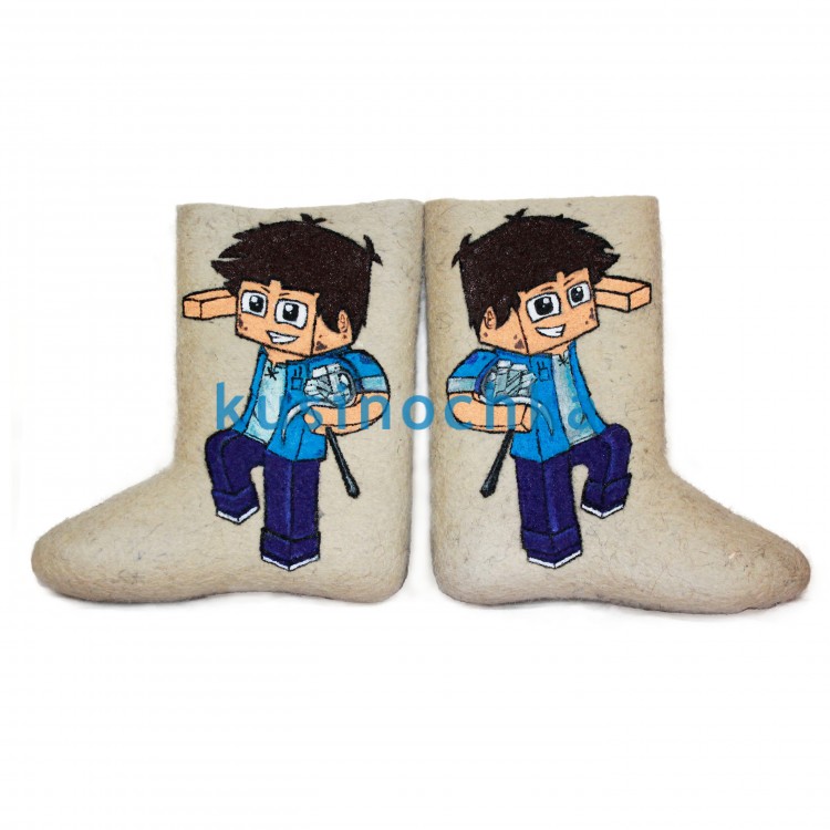 Купите недорого детские валенки-самокатки в нашем интернет-магазине валенок от предприятия "Кусиночка" Челябинская область, г. Куса. Валенки - это удобная и теплая детская обувь из войлока для девочек и мальников. Белые детские валенки для мальчика с нарисованным акриловыми красками мальчика. с игрушкой в руках - это не просто мягкая и полезная зимняя обувь, это еще и современный модный аксессуар.