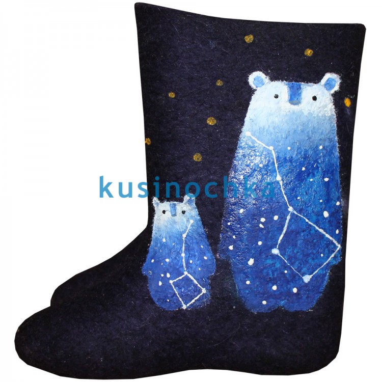 Купите в нашем интернет-магазине от пимокатного цеха "Кусиночка" г. Куса, очень милые детские валенки для дочки или сыночка, на которых изображены мама или папа со своим малышом "Большая и малая медведица". Эти валенки станут прекрасным дополнением зимнего костюма Вашего малыша. Мы также можем изготовить такие валенки для мамы или папы, и Вы всей семьей будете в тренде. Тип декора - акриловые краски.