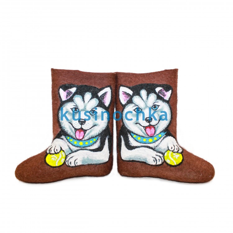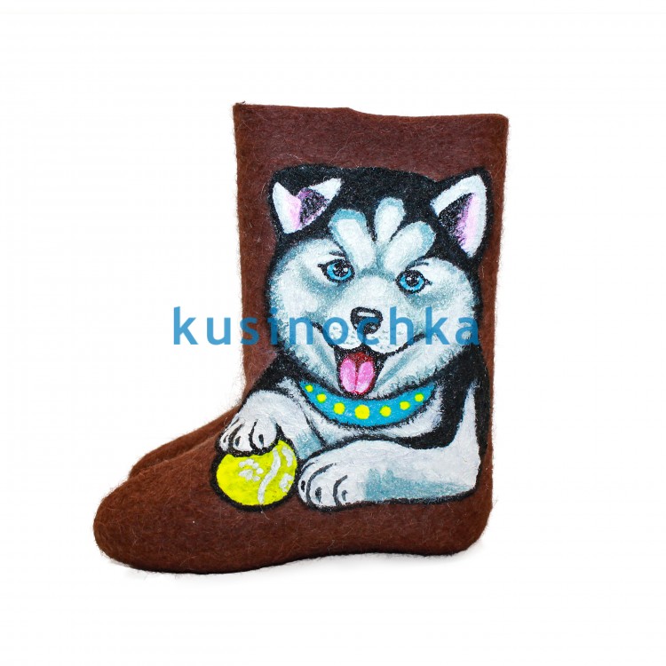 Купите в нашем интернет-магазине от пимокатного цеха "Кусиночка" г. Куса, красивые и теплые валенки-самокатки для девочек и мальчиков с нарисованным акриловыми красками щенком хаски.Валенки не только согреют ноги Вашего ребенка, но и станут прекрасным дополнением к его зимнему гардеробу.