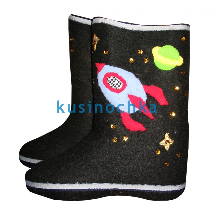 Черные валенки для наших любимых маленьких мужчин. Теплые и уютные валенки с декором - тематика космос: ракета и планеты из флиса, звезды из бисера и пайеток, верх и низ валенок отделан тесьмой.