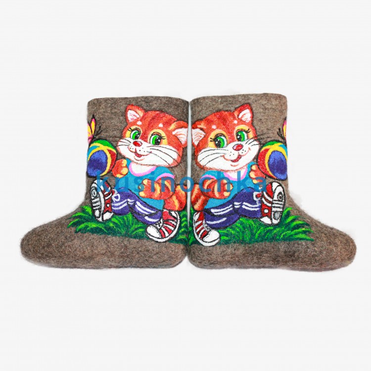Купите в нашем интернет-магазине от пимокатного цеха "Кусиночка" г. Куса, красивые и теплые валенки-самокатки для детей с нарисоваными акриловыми красками котом-футболистом. Детские валенки "Кот-футболист" по настоящему стануть отличным подарком Вашему ребенку или внуку на престоящие праздники, ведь они не только согреют ноги Вашего ребенка, но и станут прекрасным дополнением к его зимнему гардеробу.