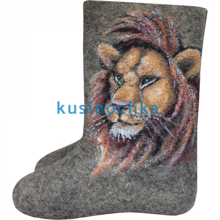 Купите в нашем интернет-магазине от пимокатного цеха "Кусиночка" г. Куса, красивые и теплые детские валенки-самокатки с дизайнерским рисунком акриловыми красками мордой льва из серии валенок "Звери" . Детские валенки "Лео" не только согреют ноги Вашего ребенка, но и станут прекрасным дополнением к его зимнему гардеробу.
