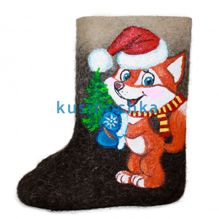 Купите в нашем интернет-магазине от пимокатного цеха "Кусиночка" г. Куса, красивые и теплые валенки-самокатки для детей с нарисованным акриловыми красками лисенком в новогоднем колпачке и с елочкой в лапках. Детские валенки "Новогодний лис" по настоящему стануть отличным подарком Вашему ребенку или внуку на престоящие праздники, ведь они не только согреют ноги Вашего ребенка, но и станут прекрасным дополнением к его зимнему гардеробу.