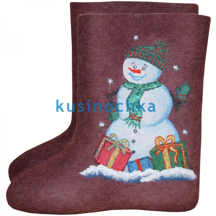 На детских валенках - самокатках "Новогодний снеговик" веселый и добрый снеговик поджидает деда Мороза и Снегурочку, чтобы они раздали подарки детям на Новый год. Детские валенки - самокатки "Новогодний снеговик" изготовлены нашими пимокатами вручную из 100 % овечьей шерсти и рисованы специальными несмываемыми акриловыми красками.