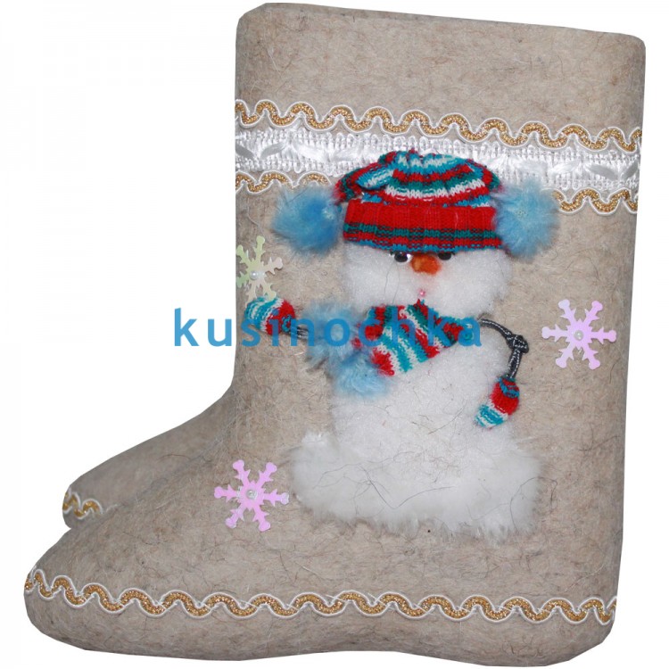 В детских валенка "Пушистый снеговичок" Ваш ребенок никогда не позабудет как сделать самому снеговика на улице, когда Вас не рядом, потому, что он может посмотреть, на свои ножки обутые в наши прекрасные валенки "Пушистый снеговичок". Детские валенки - самокатки "Снеговичек" изготовлены нашими пимокатами вручную из 100 % овечьей шерсти и декорированы снеговиком из искусственного меха, одетого в трикотажную шапочку, шарфик и варежки, окруженного пайетками-снежинками и тесьмой.