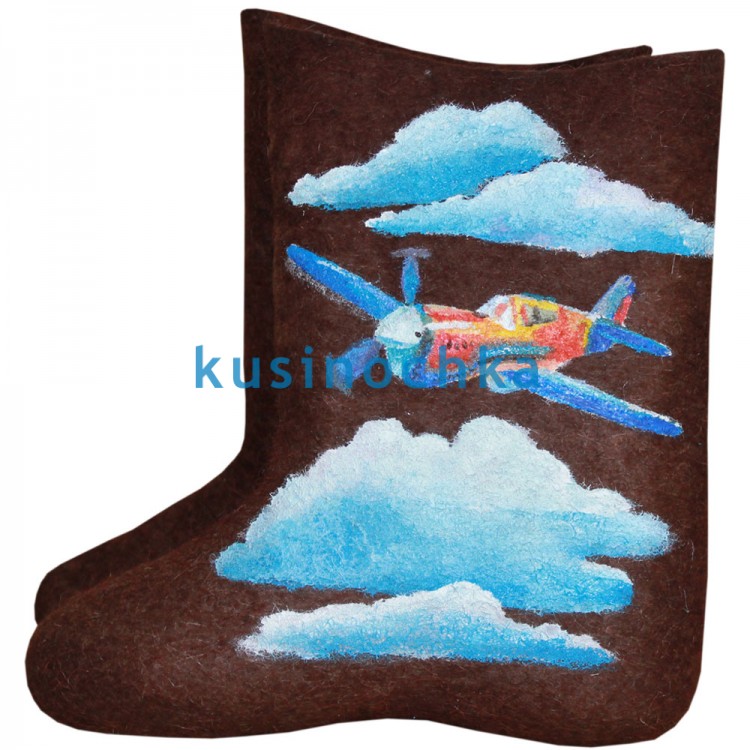 Купите в нашем интернет-магазине от пимокатной фабрики "Кусиночка" г. Куса, удобные и теплые детские валенки-самокатки недорого для мальчика (могут быть изготовлены в любом цвете) с нарисованным акриловыми красками, парящем среди облаков, самолете. Детские дизайнерские валенки "Самолет" не только согреют ноги Вашего ребенка, но и станут прекрасным дополнением к его зимнему гардеробу.