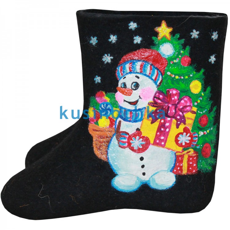 Купите в нашем интернет-магазине от пимокатного цеха "Кусиночка" г. Куса, красивые и теплые валенки-самокатки для детей с нарисованным снеговичком-почтовиком с елкой и новогодними подарками.В детских валенка "Снеговик-почтовик" Ваш ребенок никогда не позабудет как сделать самому снеговика на улице, когда Вас нет рядом, потому, что он может посмотреть, на свои ножки обутые в наши прекрасные валенки "Снеговичок". Детские валенки - самокатки "Снеговик-почтовик" изготовлены нашими пимокатами вручную из 100 % овечьей шерсти и рисованы специальными несмываемыми акриловыми красками.