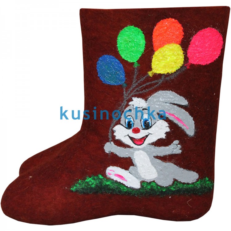 Купите в нашем интернет-магазине от пимокатного цеха "Кусиночка" г. Куса, красивые и теплые валенки-самокатки для детей с нарисованным серым зайченком с охапкой воздушных шариков в лапах. Детские валенки "Шарики" не только согреют ноги Вашего ребенка, но и станут прекрасным дополнением к его зимнему гардеробу.