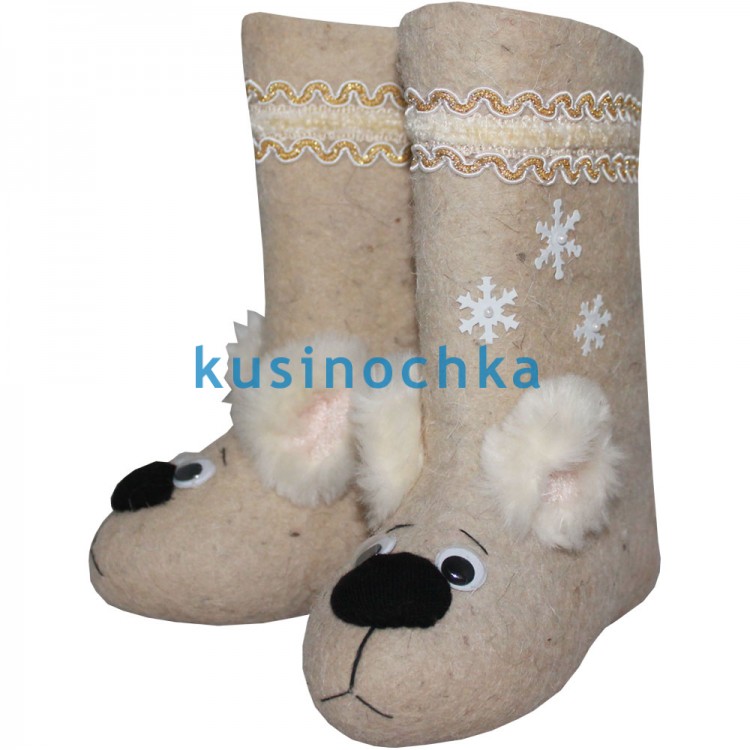 В детских валенка "Щенок" Ваш ребенок будет с удовольствие бегать по улице и рассмативать свои валеночки "Щенок". Детские валенки - самокатки "Снеговичек" изготовлены нашими пимокатами вручную из натуральной овечьей шерсти и декорированы на носке валенка мордочкой щенка: улыбка, глазки, носик, ушки из искусственного меха, окруженного пайетками-снежинками и по верху декорированы тесьмой.