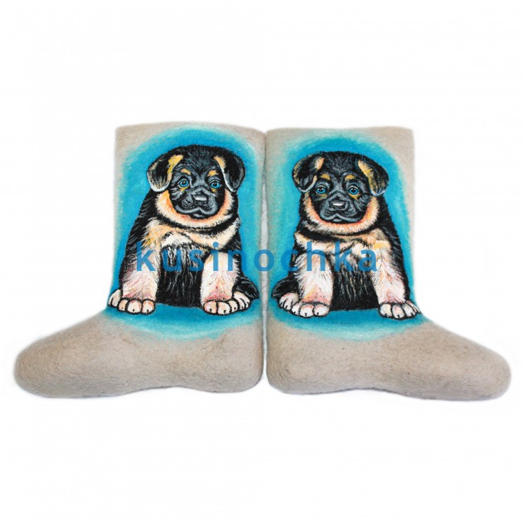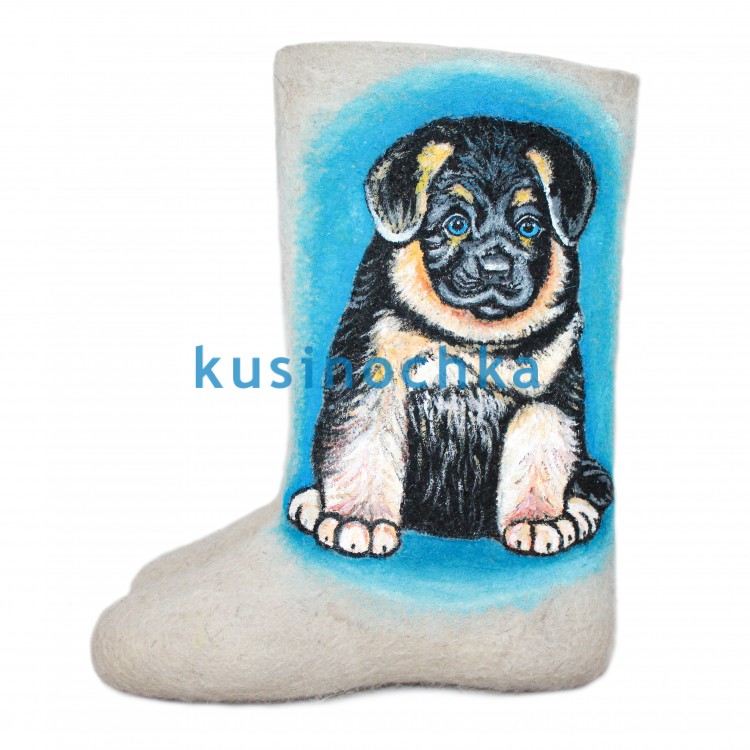 Детские валенки для мальчиков и девочек от пимокатки "Кусиночка" из маленького города Куса с нарисованным щенком немецкой овчарки, изготовлены вручную из натурального войлока нашими мастерами. Валенки из г. Куса, Челябинской области очень теплые и мягкие и не теряют форму, такие валенки прослужат Вам долгие годы и будут согревать ножки вашего ребенка в самые сильные морозы.