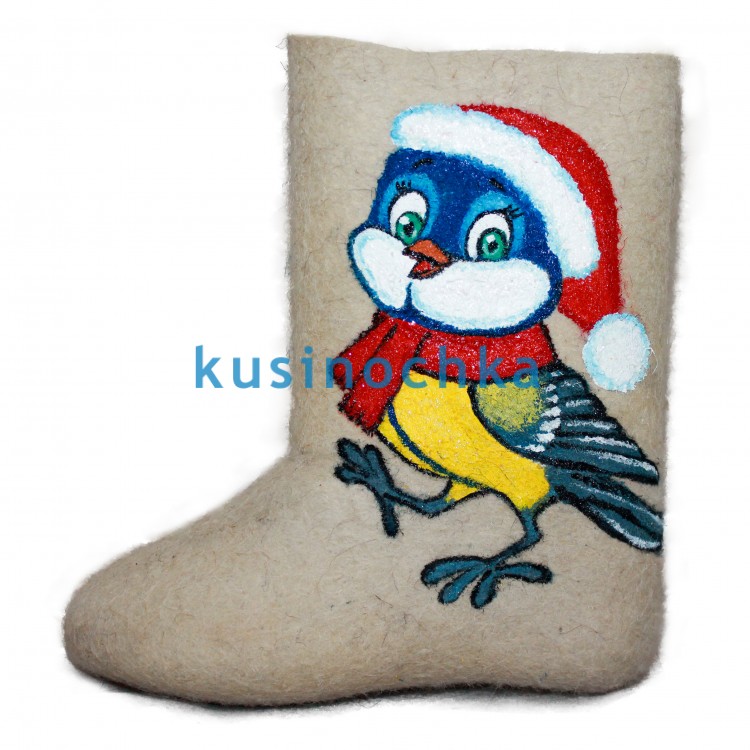 Купите в нашем интернет-магазине от пимокатного цеха "Кусиночка" г. Куса, красивые и теплые валенки-самокатки для детей с нарисованнй акриловыми красками синичкой в колпачке и шарфе. Детские валенки "Синичка в колпачке" по настоящему стануть отличным подарком Вашему ребенку или внуку на престоящие праздники, ведь они не только согреют ноги Вашего ребенка, но и станут прекрасным дополнением к его зимнему гардеробу.