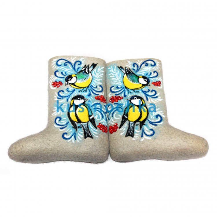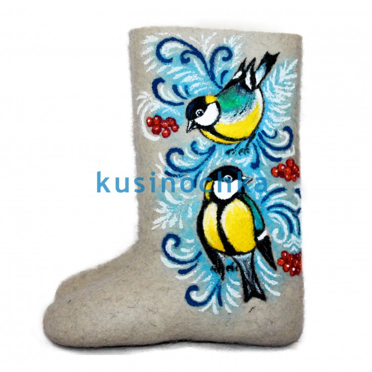 Купите в нашем интернет-магазине от пимокатного цеха "Кусиночка" г. Куса, красивые и теплые валенки-самокатки для детей с нарисоваными акриловыми красками синичками на веточках рябины. Детские валенки "Синички" по настоящему стануть отличным подарком Вашему ребенку или внуку на престоящие праздники, ведь они не только согреют ноги Вашего ребенка, но и станут прекрасным дополнением к его зимнему гардеробу.