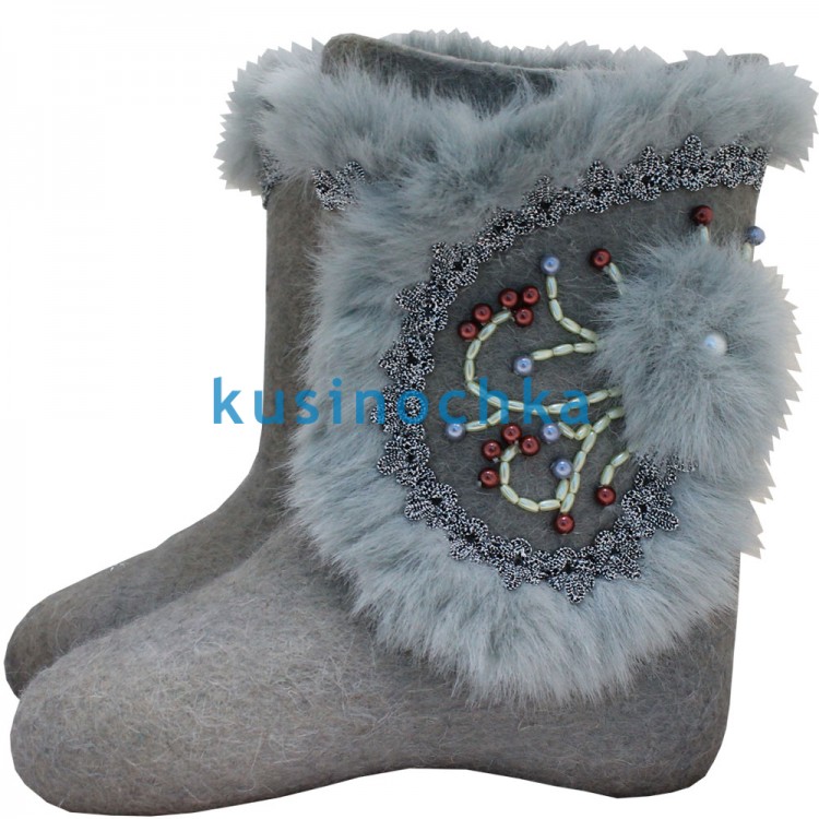 Купите для своих юных красавиц теплые и мягкие детские серые валенки-самокатки "Белый снег", на которых, серым искусственным мехом и тесьмой оторочен верх валенка и середина, а также внутри вышит рисунок из бисера. Фирма по производству валенок "Кусиночка" с любовью в ручную изготвавливает свои валенки-самокатки из натуральной овечьей шерсти как для детей, так и для взрослых.