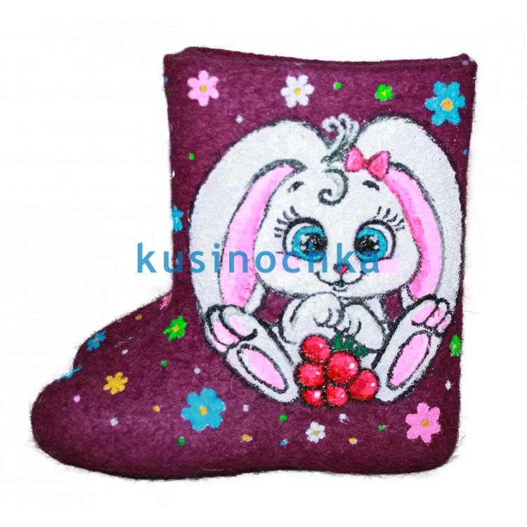Купите в нашем интернет-магазине от пимокатного цеха "Кусиночка" г. Куса, красивые и теплые валенки-самокатки для девочек с нарисованным акриловыми красками зайчонком-девочкой, в окружении цветочной поляны. Детские валенки "Заинька" по настоящему стануть отличным подарком Вашему ребенку или внуку на престоящие праздники, ведь они не только согреют ноги Вашего ребенка, но и станут прекрасным дополнением к его зимнему гардеробу.