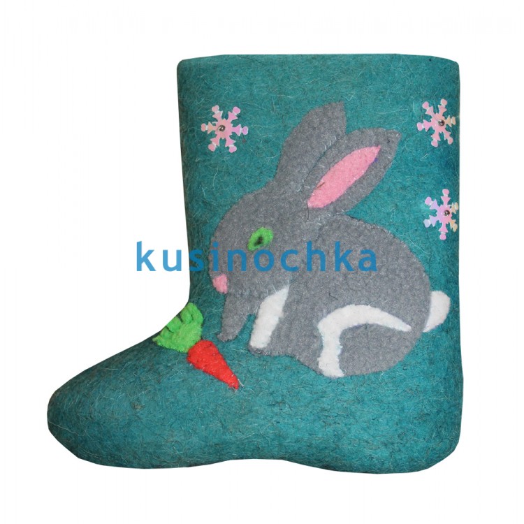 Зимние детские валенки "Заяц с морковкой", валенки выполнены из натуральной овечьей шерсти с ручным декором из флиса, бусин и пайеток-снежинка.