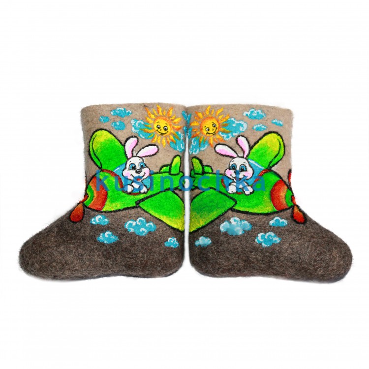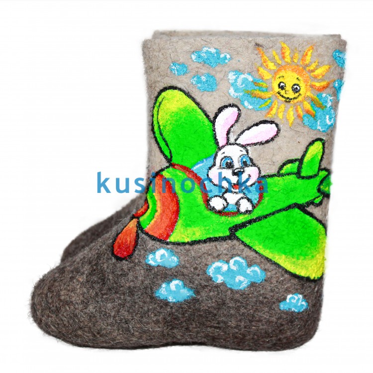 Купите в нашем интернет-магазине от пимокатного цеха "Кусиночка" г. Куса, красивые и теплые валенки-самокатки для детей с нарисоваными акриловыми красками зайцем-летчиком, парящим на самолете. Детские валенки "Заяц-летчик" по настоящему стануть отличным подарком Вашему ребенку или внуку на престоящие праздники, ведь они не только согреют ноги Вашего ребенка, но и станут прекрасным дополнением к его зимнему гардеробу.