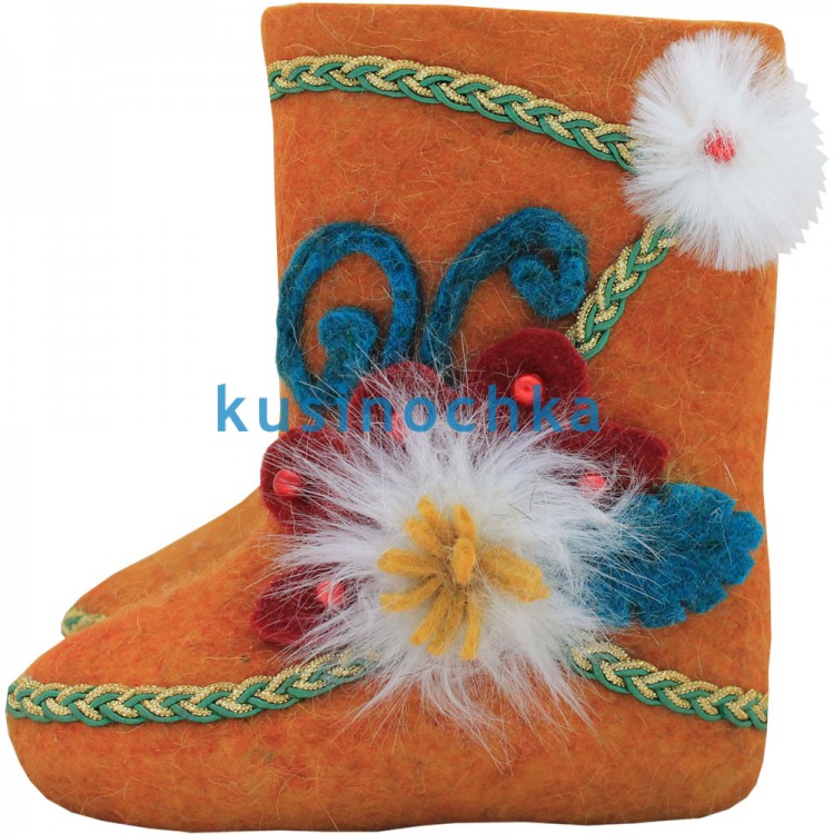 В детских цветных валенка "Цветочный декор" Ваша дочка или внучка будет с удовольствием бегать по белому мягкому снег и уж точно ни за что не замерзет в наших валенках от пимокатного цеха "Кусиночка", г. Куса. Детские валенки - самокатки "Цветочный декор" изготовлены нашими пимокатами вручную из натуральной овечьей шерсти и декорированы войлочным цветком с буснами и исскуственным мехом, а так же тесьмой.