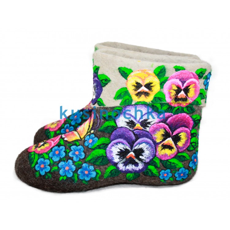 Купите недорогие зимние женские укороченные валенки-самокатки в нашем интернет-магазине валенок от пимокатого цеха "Кусиночка" Челябинская область, г. Куса. Современные короткие валенки - это удобная и теплая красивая обувь из войлока. Цветные короткие женские валенки ручной валки с нарисованными цветами анютиными глазками - это не просто эксклюзивные укороченные валенки, это модные и легкие сортивные валенки-ботинки. В таких необычных, но в тоже время натуральных коротких валенках из овечьей шерсти, Вы почувствуете себя настоящей русской красавицей. Тип декора - акриловые краски.