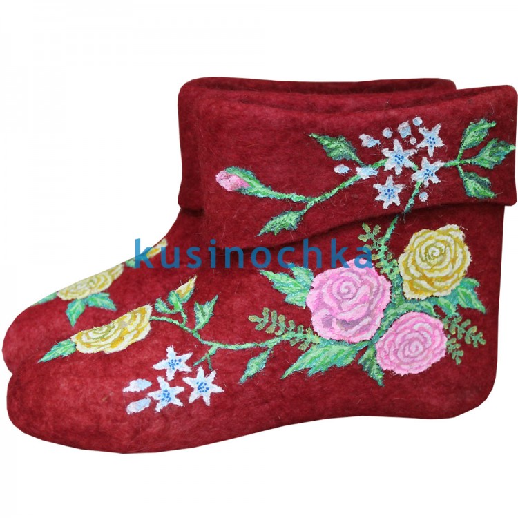 Купите недорогие зимние женские укороченные валенки-самокатки в нашем интернет-магазине валенок от пимокатого цеха "Кусиночка" Челябинская область, г. Куса. Современные короткие валенки - это удобная и теплая красивая обувь из войлока. Красные короткие женские валенки ручной валки с красивыми кустовыми розами - один из вариантов имитации жостовской росписи из серии валенок "Русские мотивы" - это не просто эксклюзивные укороченные валенки, это модные и легкие сортивные валенки-ботинки. В таких необычных, но в тоже время натуральных коротких валенках из овечьей шерсти, Вы почувствуете себя настоящей русской красавицей. Тип декора - акриловые краски.