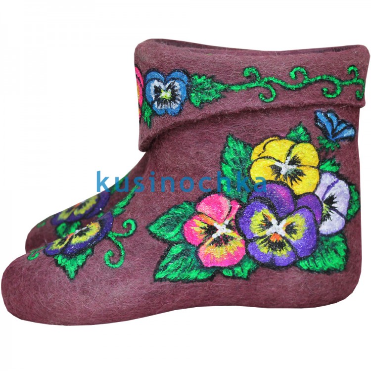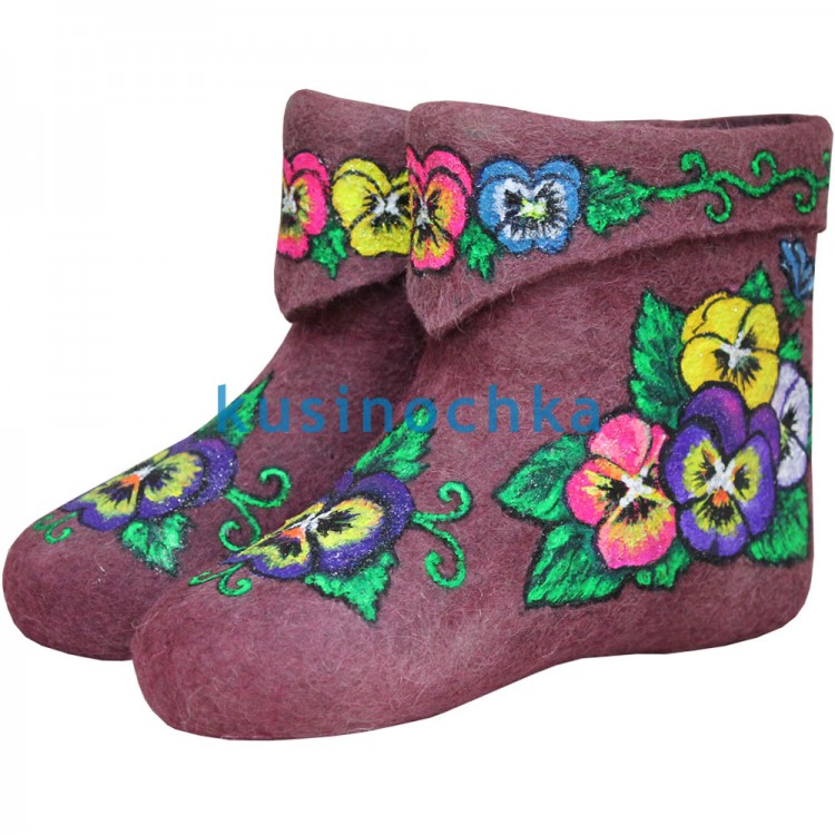 Купите недорогие зимние женские укороченные валенки-самокатки в нашем интернет-магазине валенок от пимокатого цеха "Кусиночка" Челябинская область, г. Куса. Современные короткие валенки - это удобная и теплая красивая обувь из войлока. Цветные короткие женские валенки ручной валки с нарисованными цветами фиалки трехцветной или анютиными глазками - это не просто эксклюзивиные укороченные валенки, это модные и легкие сортивные валенки-ботинки. В таких необычных, но в тоже время натуральных коротких валенках из овечьей шерсти, Вы почувствуете себя настоящей русской красавицей. Тип декора - акриловые краски.