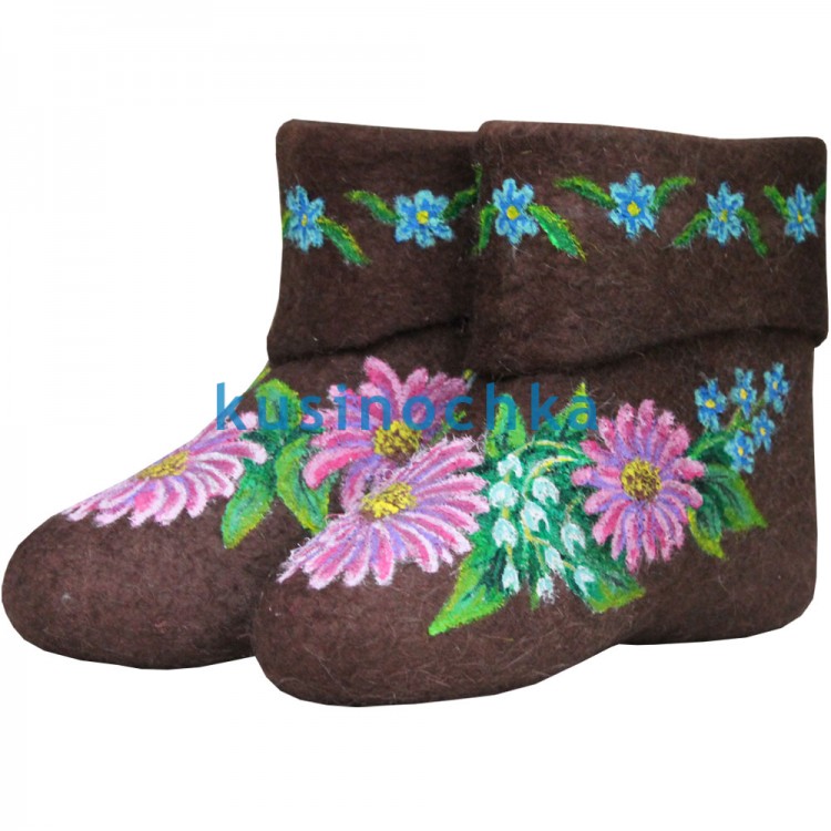Купите недорогие зимние женские укороченные валенки-самокатки в нашем интернет-магазине валенок от пимокатого цеха "Кусиночка" Челябинская область, г. Куса. Современные короткие валенки - это удобная и теплая красивая обувь из войлока. Цветные короткие женские валенки ручной валки с нарисованными цветами незабудки, ландыша и цветной ромашки - это не просто уникальные укороченные валенки, это модные и легкие сортивные валенки-ботинки. В таких необычных, но в тоже время натуральных коротких валенках из овечьей шерсти, Вы почувствуете себя настоящей русской красавицей. Тип декора - акриловые краски.