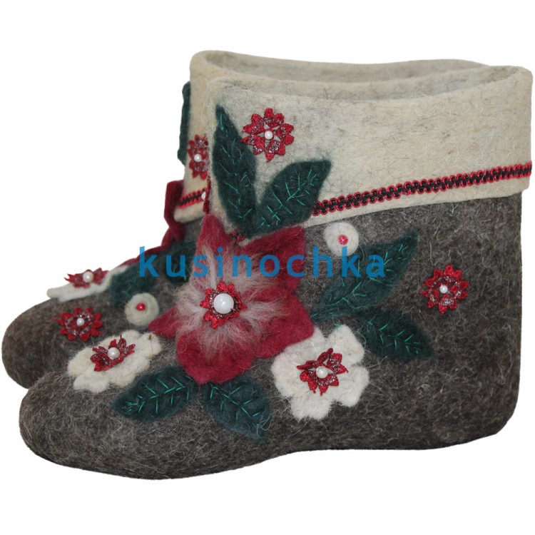 Купите недорогие зимние женские короткие валенки-самокатки (полуваленки) в нашем официальном интернет-магазине производителя валенок "Кусиночка" Челябинская область, г. Куса. Красивые короткие валенки - это модная и теплая обувь из натуральной шерсти. Натуральные комбинированные полуваленки ручной работы с ярким цветками из войлока и бусин, словно цветочная поляна расположиись на наших валенках, это не просто дизайнерские короткие валенки, это шикарные валенки-ботинки. В таких необычных, но в тоже время натуральных коротких валенках из овечьей шерсти, Вы почувствуете себя настоящей красоткой.