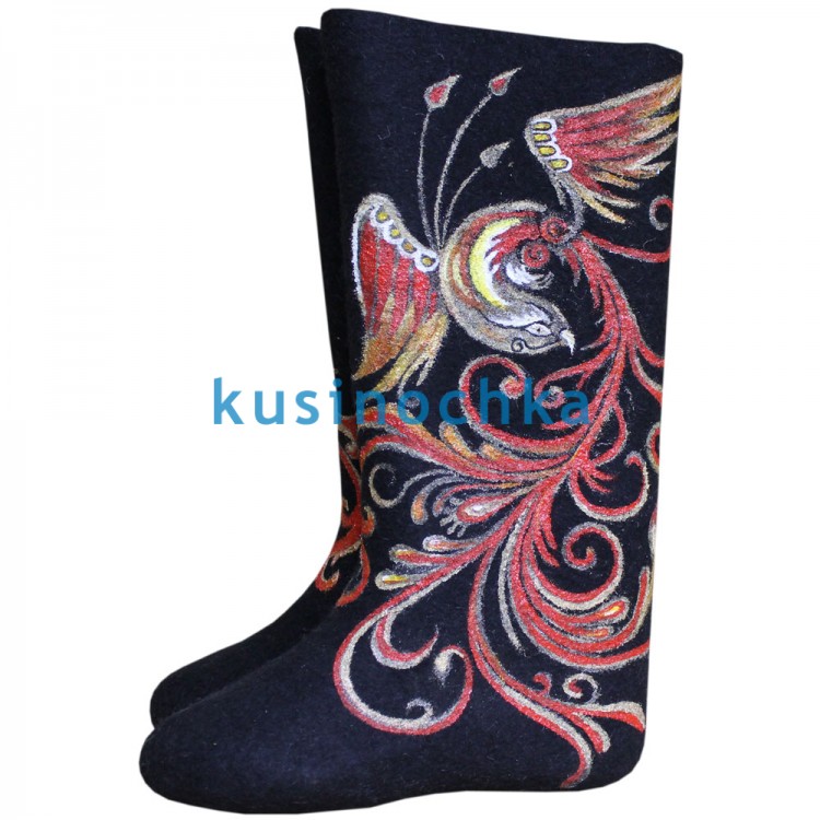 Купите шикарные зимние женские валенки-самокатки в нашем интернет-магазине валенок от пимокатого цеха "Кусиночка" Челябинская область, г. Куса. Современные валенки - это удобная и теплая красивая обувь из войлока. Черные женские валенки ручной валки с прекрасной жар птицей, как один из вариантов имитации городецкой росписи из серии валенок "Русские мотивы" - это не просто эксклюзивные валенки, это модные и легкие валенки-сапоги. В таких необычных, но в тоже время натуральных валенках из овечьей шерсти, Вы почувствуете себя настоящей русской красавицей. Тип декора - акриловые краски.