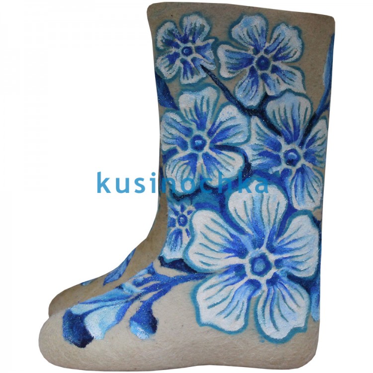 Очень красивые валенки с рисунком голубых цветов c имитацией одного из старинных видов русской росписи - гжели из серии валенок "Русские мотивы", были специально расшиты для фестиваля "Уральский валенок", проходящий в 2018 году в г. Куса, Челябинской области. Тип декора: акриловые краски.