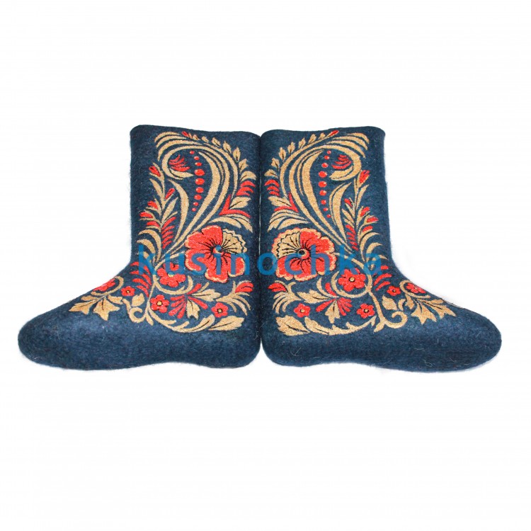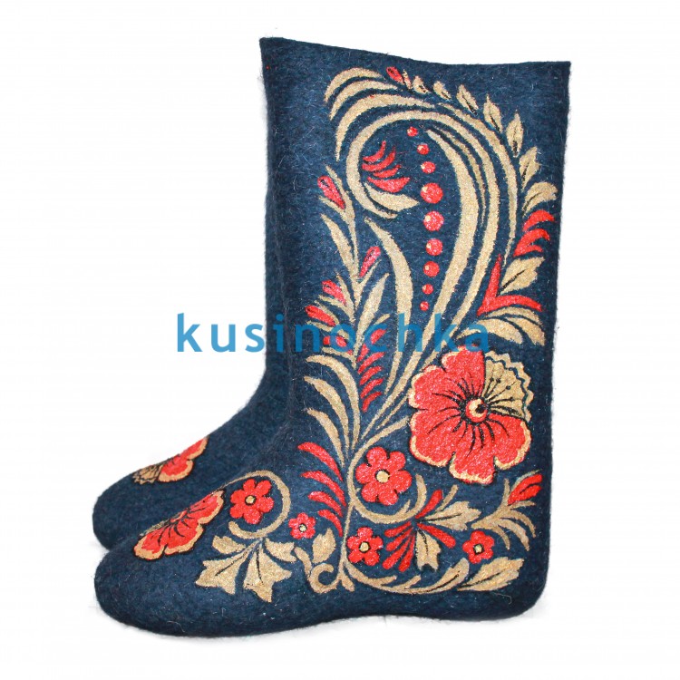 Купите недорогие зимние женские валенки-самокатки в нашем интернет-магазине валенок от пимокатого цеха "Кусиночка" Челябинская область, г. Куса. Расшитые валенки - это удобная и теплая красивая обувь из 100% овечьей шерсти. Цветные женские валенки ручной валки с красивым рисунком акриловыми красками элементов хохломской росписи, согласно стихотворению "Спят цветы до зорьки ясной в лунном светет и росе ночью тихой и прекрасной в среднерусской полосе" из серии валенок из серии "Русские мотивы" - это не просто эксклюзивные валенки, это модная и легкая обувь на зиму. В таких необычных, но в тоже время натуральных валенках из овечьей шерсти, Вы почувствуете себя настоящей русской красавицей.