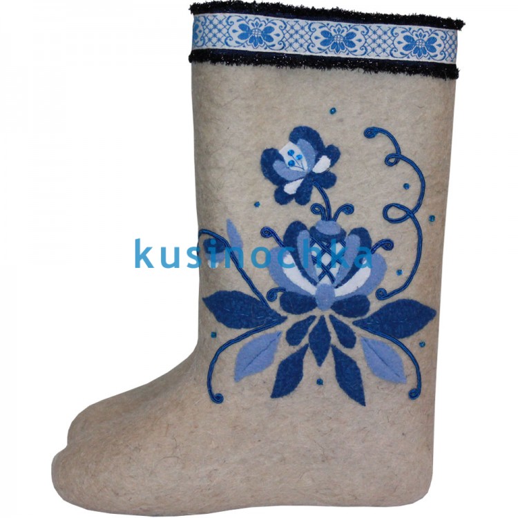 Очень красивые валенки с оригинальным декором верхней части валенка, c имитацией одного из старинных видов русской росписи - гжели из серии валенок "Русские мотивы", были специально расшиты для фестиваля "Уральский валенок", проходящий в 2018 году в г. Куса, Челябинской области. Тип декора: тесьма, фетр, бисер.
