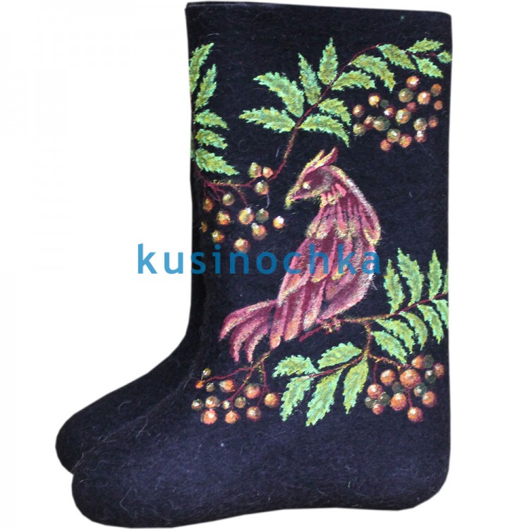 Купите недорогие зимние женские валенки-самокатки в нашем интернет-магазине валенок от пимокатого цеха "Кусиночка" Челябинская область, г. Куса. Современные валенки - это удобная и теплая красивая обувь из войлока. Черные классические женские валенки ручной валки с яркими и вкусными гроздьями рябины и традиционной птицы, как один из вариантов имитации хохломской росписи из серии валенок "Русские мотивы" - это не просто эксклюзивные валенки, это модные и легкие валенки-сапоги. В таких необычных, но в тоже время натуральных валенках из овечьей шерсти, Вы почувствуете себя настоящей русской красавицей. Тип декора - акриловые краски.