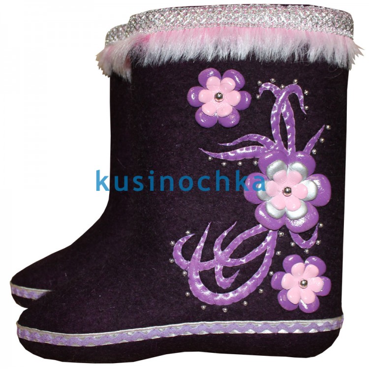 Натуральные цветные валенки с декоративными цветами сирени из двух видов кожи. Модные валенки от фабрики "Кусиночка" это не просто классические валенки-самокатки, это современная теплая зимняя обувь не только для деревни, но и для большого города.