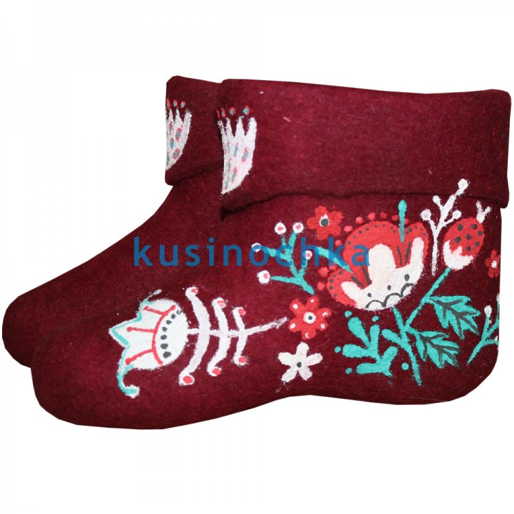 Купите недорогие зимние женские укороченные валенки-самокатки в нашем интернет-магазине валенок от пимокатого цеха "Кусиночка" Челябинская область, г. Куса. Современные короткие валенки - это удобная и теплая красивая обувь из войлока. Красные короткие женские валенки ручной валки с имитацией старинной городецкой росписи из серии валенок "Русские мотивы" - это не просто эксклюзивные укороченные валенки, это модные и легкие сортивные валенки-ботинки. В таких необычных, но в тоже время натуральных коротких валенках из овечьей шерсти, Вы почувствуете себя настоящей русской красавицей. Тип декора - акриловые краски.