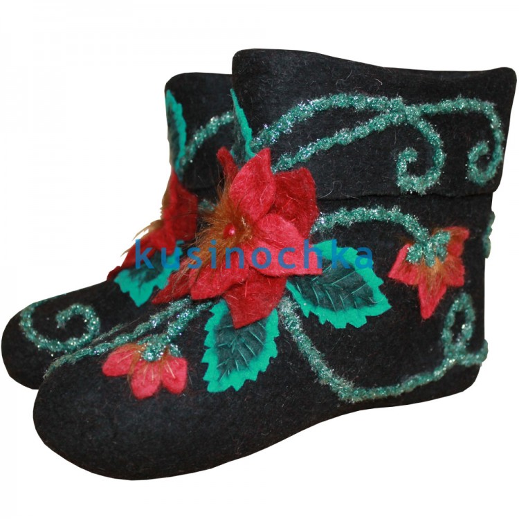 Купите недорогие зимние женские короткие валенки-самокатки (полуваленки) в нашем официальном интернет-магазине производителя валенок "Кусиночка" Челябинская область, г. Куса. Красивые короткие валенки - это модная и теплая обувь из натуральной шерсти. Черные короткие женские валенки ручной работы с ярким цветком красного мака, декорированным листьями из фетра и тесьмой, это не просто дизайнерские короткие валенки, это шикарные валенки-ботинки. В таких необычных, но в тоже время натуральных коротких валенках из овечьей шерсти, Вы почувствуете себя настоящей красоткой.