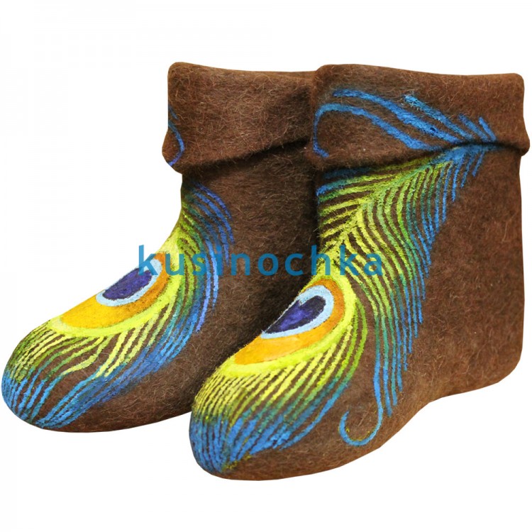 Купите недорогие зимние женские укороченные валенки-самокатки в нашем интернет-магазине валенок от пимокатого цеха "Кусиночка" Челябинская область, г. Куса. Современные короткие валенки - это удобная и теплая красивая обувь из войлока. Цветные короткие женские валенки ручной валки с с ярким рисунком акриловыми красками пера павлина - это не просто эксклюзивные укороченные валенки, это модные и легкие сортивные валенки-ботинки. В таких необычных, но в тоже время натуральных коротких валенках из овечьей шерсти, Вы почувствуете себя настоящей павой.