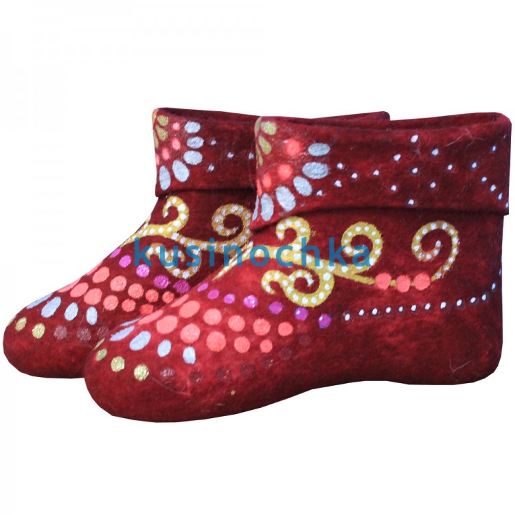 Купите недорогие зимние женские короткие валенки-самокатки (полуваленки) в нашем интернет-магазине валенок от пимокатого цеха "Кусиночка" Челябинская область, г. Куса. Современные короткие валенки - это удобная и теплая красивая обувь из натурального войлока. Касные короткие женские валенки ручной валки с оригинальным рисунком солнца, играющего всеми цветами радуги на красном фоне, это не просто эксклюзивные укороченные валенки, это модные и легкие спортивные валенки-ботинки. Тип декора - акриловые краски.