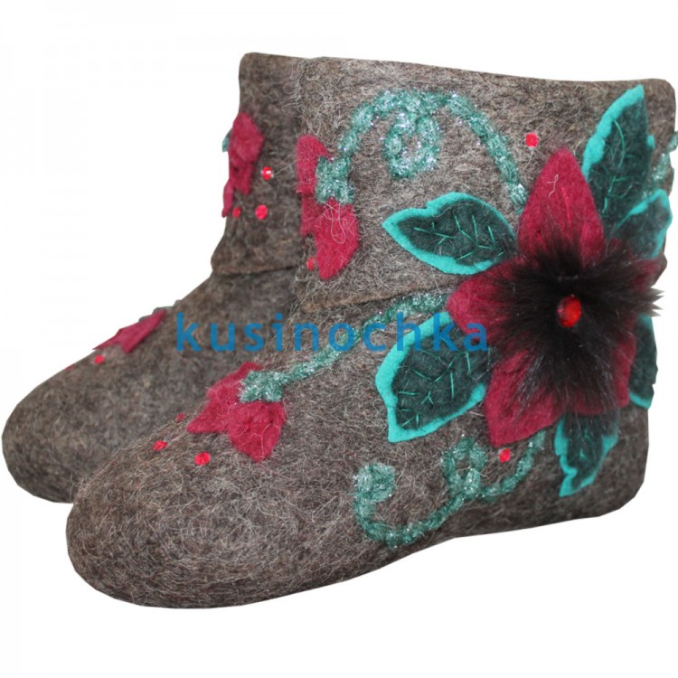 Купите недорогие зимние женские короткие валенки-самокатки (полуваленки) в нашем официальном интернет-магазине производителя валенок "Кусиночка" Челябинская область, г. Куса. Красивые короткие валенки - это модная и теплая обувь из натуральной шерсти. Натуральные серые короткие женские валенки ручной работы с ярким цветком красного мака, декорированным листьями из фетра и тесьмой, это не просто дизайнерские короткие валенки, это шикарные валенки-ботинки. В таких необычных, но в тоже время натуральных коротких валенках из овечьей шерсти, Вы почувствуете себя настоящей красоткой.