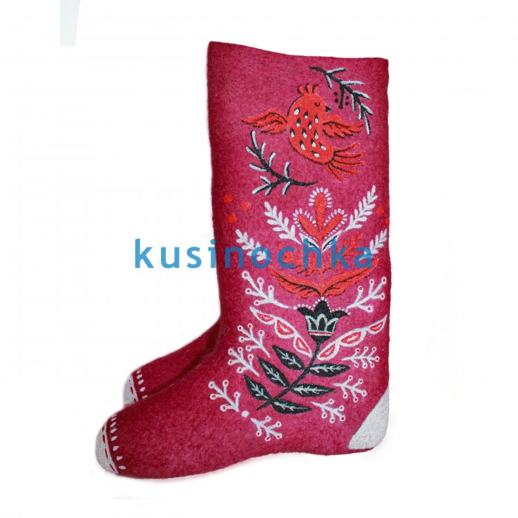 Купите недорогие зимние женские валенки-самокатки в нашем интернет-магазине валенок от пимокатого цеха "Кусиночка" Челябинская область, г. Куса. Современные валенки - это удобная и теплая красивая обувь из войлока. Бордовые женские валенки ручной валки с красивой жар птицей, взмывающей вверх, как один из вариантов имитации городецкой росписи из серии валенок "Русские мотивы" - это не просто эксклюзивные валенки, это модные и легкие валенки-сапоги. В таких необычных, но в тоже время натуральных валенках из овечьей шерсти, Вы почувствуете себя настоящей русской красавицей. Тип декора - акриловые краски.