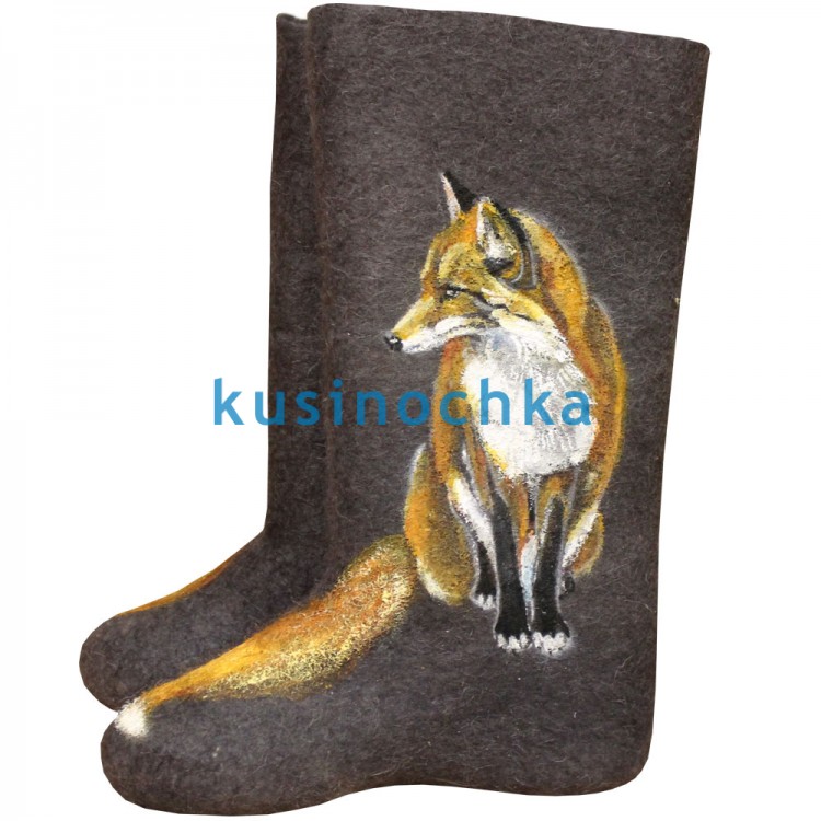 Купите недорого женские валенки-самокатки в нашем интернет-магазине валенок от пимокатки "Кусиночка" Челябинская область, г. Куса. Валенки - это удобная и теплая обувь из войлока. Цветные серые женские валенки с дизайнерским рисунком акриловыми красками лисицы из серии валенок "Звери" - это не просто мягкая и теплая зимняя обувь, это еще и современный модный аксессуар.