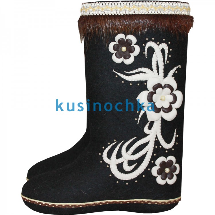 Очень красивые валенки, которые не успевают храниться на полке в магазине фабрики валенок "Кусиночка", как они тут же распродаются - это наши новые расшитые неокрашенной кожей и тесьмой комбинированные валенки "Натуральные цветы".