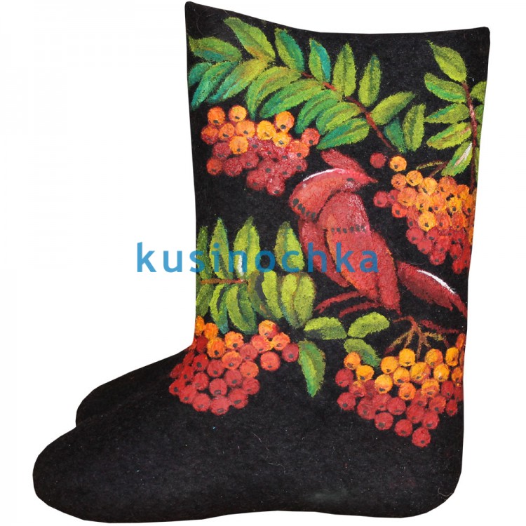 Купите недорогие зимние женские валенки-самокатки в нашем интернет-магазине валенок от пимокатого цеха "Кусиночка" Челябинская область, г. Куса. Современные валенки - это удобная и теплая красивая обувь из войлока. Черные классические женские валенки ручной валки с яркими и вкусными гроздьями рябины и традиционной птицы, как один из вариантов имитации хохломской росписи из серии валенок "Русские мотивы" - это не просто эксклюзивные валенки, это модные и легкие валенки-сапоги. В таких необычных, но в тоже время натуральных валенках из овечьей шерсти, Вы почувствуете себя настоящей русской красавицей. Тип декора - акриловые краски.