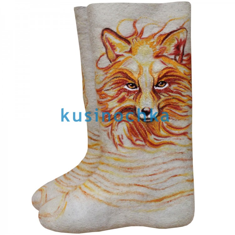 Купите недорого женские валенки-самокатки в нашем интернет-магазине валенок от пимокатки "Кусиночка" Челябинская область, г. Куса. Валенки - это удобная и теплая обувь из войлока. Классические белые женские валенки с дизайнерским рисунком акриловыми красками ярко рыжей лисицы из серии валенок "Звери" - это не просто мягкая и теплая зимняя обувь, это еще и современный модный аксессуар.