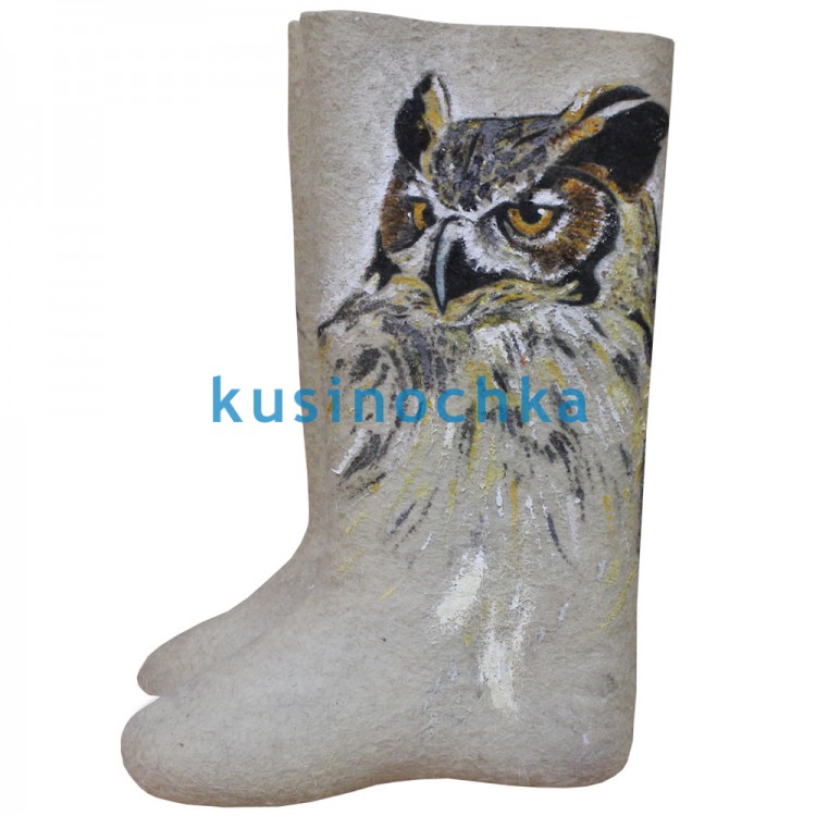 Купите недорогие зимние женские валенки-самокатки в нашем интернет-магазине валенок от пимокатого цеха "Кусиночка" Челябинская область, г. Куса. Современные валенки - это удобная и теплая красивая обувь из войлока. Белые женские валенки ручной валки с рисунком акриловыми красками совы с пронзительным взглядом из серии валенок "Птицы" - это не просто эксклюзивные валенки, это модные и легкие валенки-сапоги.