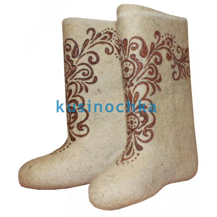 Коричневой акриловой краской нанесены узоры на белых валеночках словно на доске выжженый фрагмент. Спокойно но эффектно.