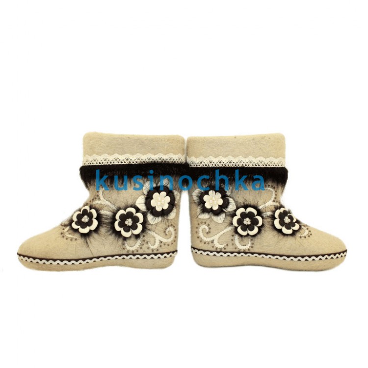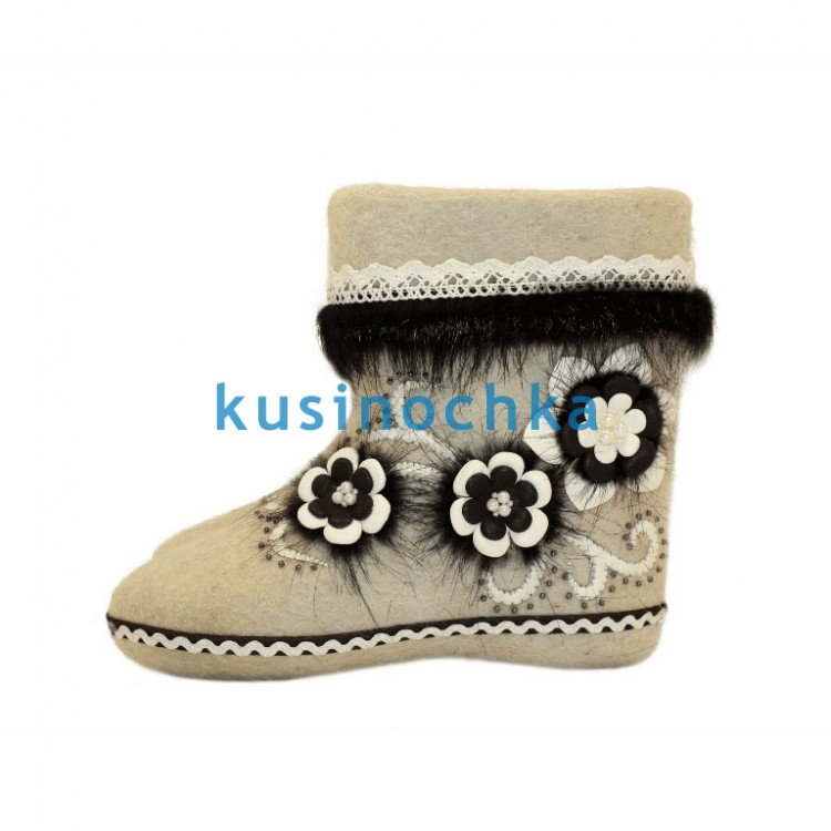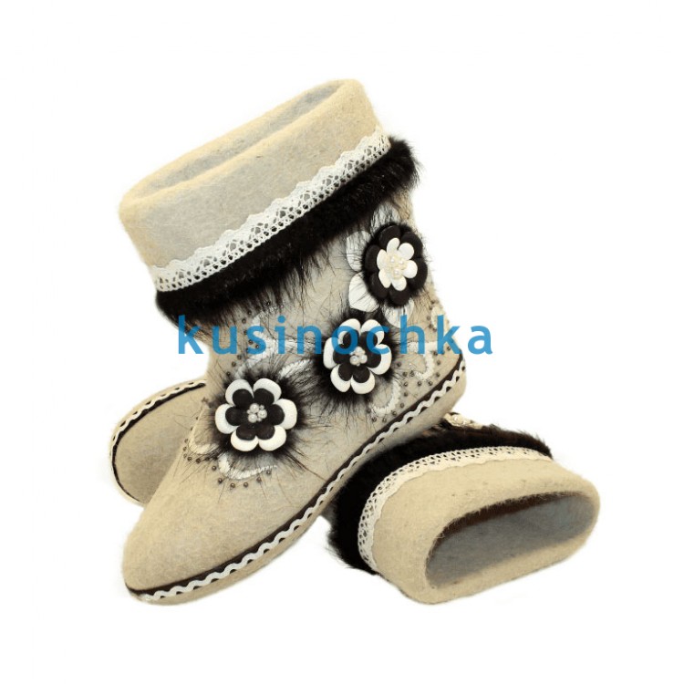 Полуваленки ручной валки, декорированные выпуклой цветочной аппликацией, выполненной методом художественного валяния (сухое иглопробивное формование). Аппликация создаётся из натуральной шерсти, имеет рельефную поверхность и тактильно ощутимый объём — лепестки слегка возвышаются над поверхностью валенка, сохраняя мягкость и естественную фактуру.