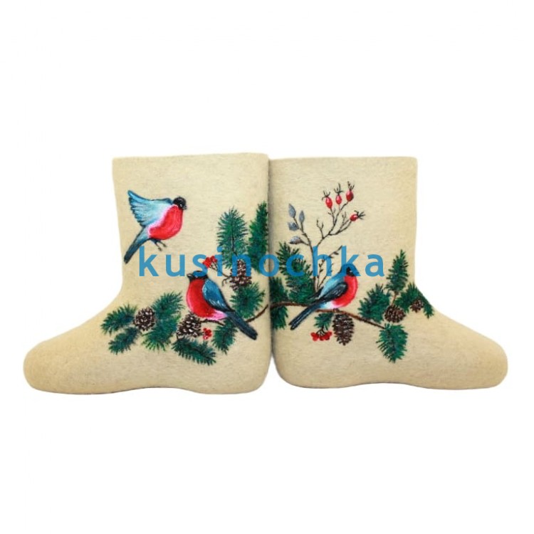 Полуваленки ручной валки на светлой основе, с художественным рисунком: один снегирь прилетает, второй — сидит на еловой ветке, слегка склонив голову. Сцена передаёт движение и связь — без пафоса, в лёгкой, графичной манере.