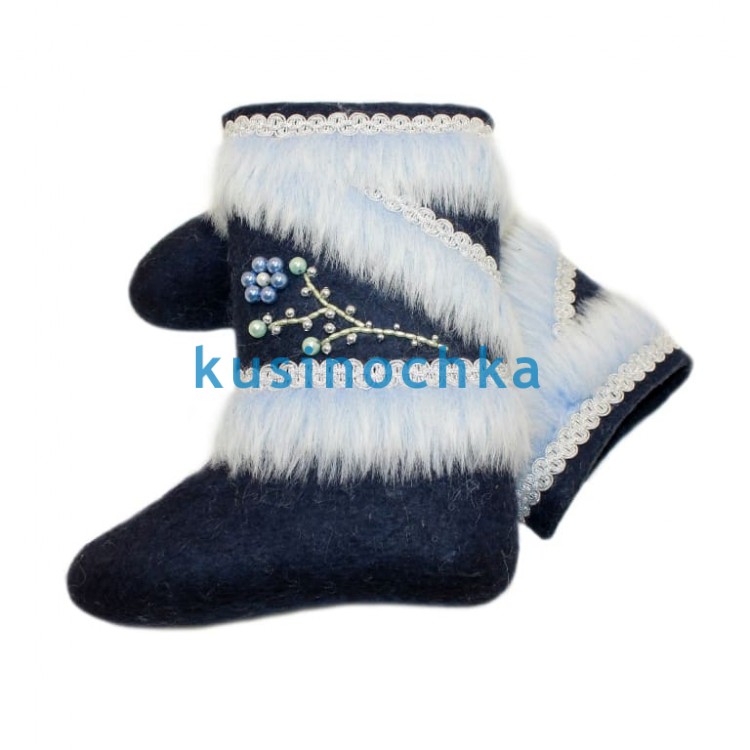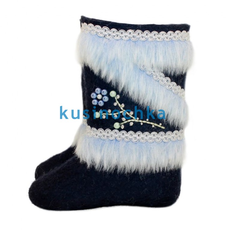 Полноразмерные валенки ручной валки на чёрной основе, с многослойной декоративной отделкой: