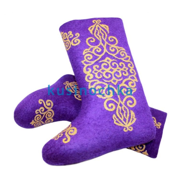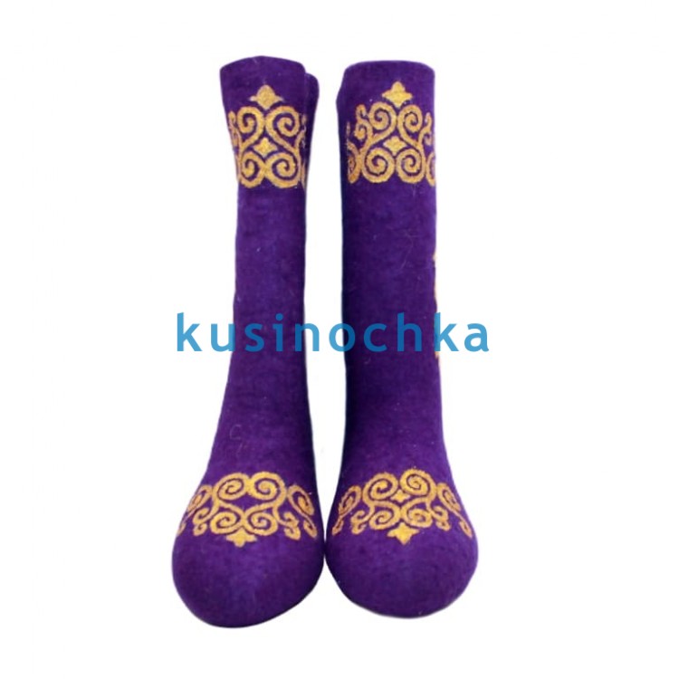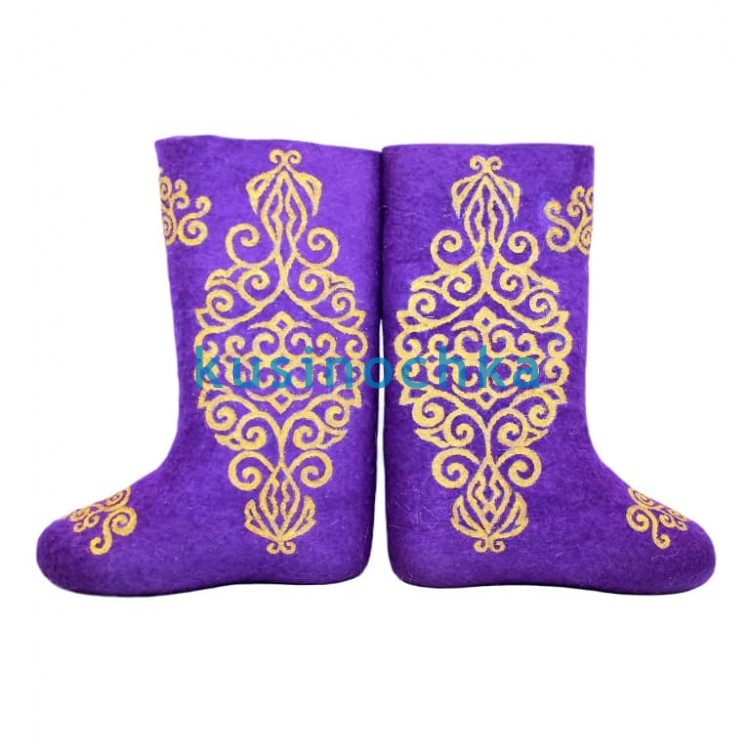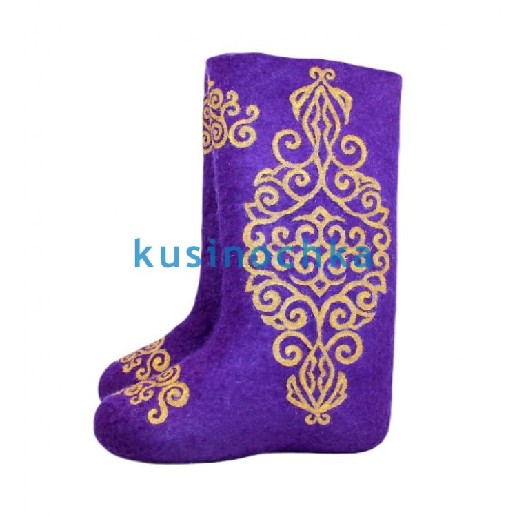 Полноразмерные валенки ручной валки на фиолетовой основе, с абстрактным узором, выполненным золотистой акриловой краской. Композиция — волны, завитки, намёки на восточные или барочные мотивы — выдержана в духе «роскоши без пафоса»: золото не блестит, а светится — матовым, тёплым пигментом.