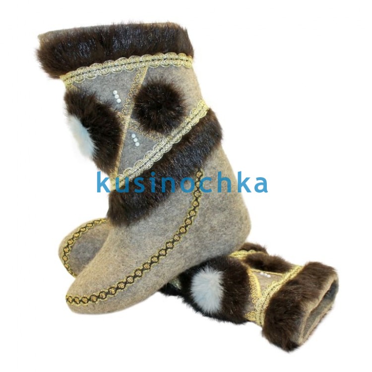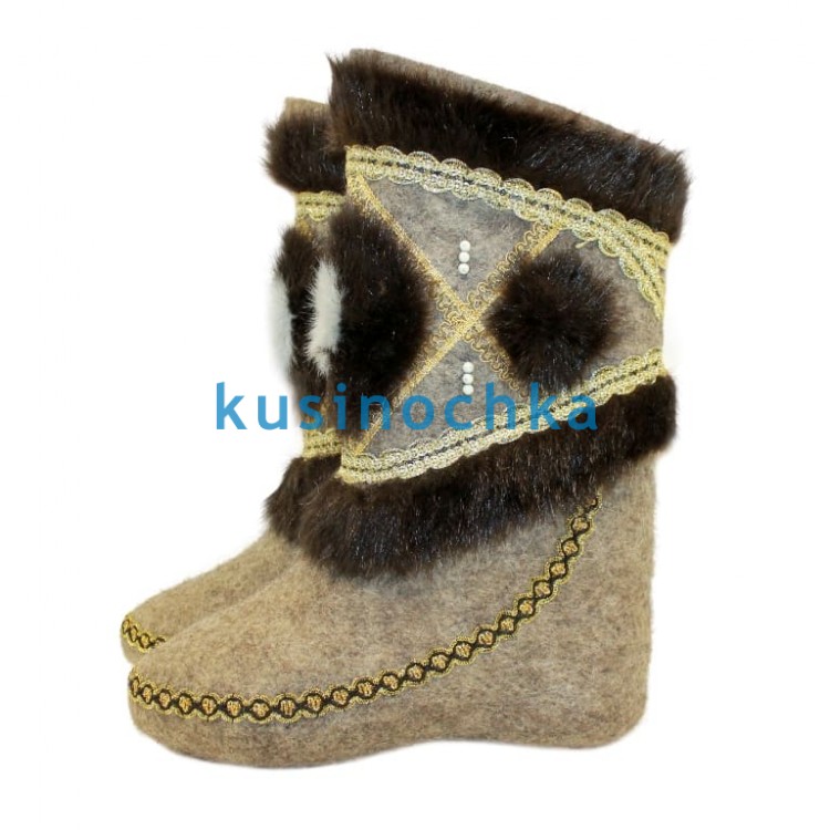 Полноразмерные валенки ручной валки на светлой основе, с отделкой золотисто-чёрной тесьмой, опушкой из натурального меха и меховым узором на теле валенка (например, стилизованная корона, цветок или геральдический мотив — по исполнению).