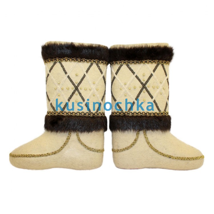 Полноразмерные валенки ручной валки с декоративной отделкой: по верхнему краю — тесьма с геометрическим узором, в которую вплетены бусины. По внешнему срезу отворота — опушка из натурального меха тёмного цвета.